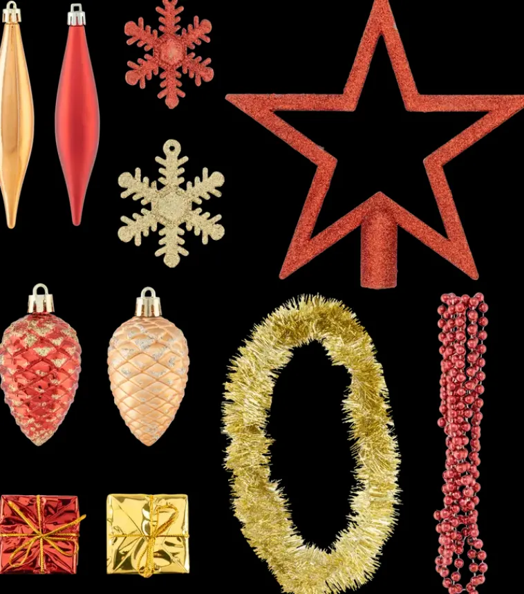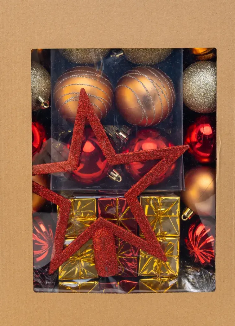 Kuusenkoristesetti 100 Kpl. Pakkaus Sisältää Kiiltävä-, Matta- Ja Glitterpintaisia Joulupalloja Ja Kuusenkoristeita Sekä Koristenauhaa, Helmiketjun Ja Latvatähden.