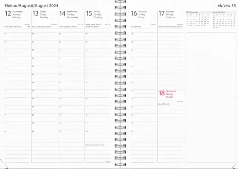 Kierrätetyn Pp-Kannen Takana 4 Aihetta Muovitaskussa, Kuminauhalla. Kalenterin Aukeamalla Yksi Viikko, Tuntijaotus 08-20, Palsta Muistiinpanoille, Kuluvan Ja Seuraavan Kuukauden Kalenteritaulukot. Kalenteri Sisältää Nimipäivät, Juhlapyhät, Liputuspäivät, Kuun Vaiheet, Vuosisuunnitelmat Kuluvalle Ja Seuraavalle Vuodelle, Vuosiruudukot Edelliselle, Kuluvalle Ja Kahdelle Seuraavalle Vuodelle, Kalendaariset Tiedot, Auringon Nousu- Ja Laskuajat, Yleiset Pyhäpäivät Maailmalla Ja Muistiinpanosivut. Kalenteriosa: Vk 48 2023-Vk 1 2025. Kolmikielinen: Suomi/Ruotsi/Englanti. Parikierresidottu. Fsc®. Koko: 148X210 Mm (A5).
