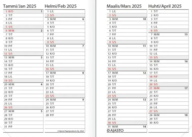 Kokonsa Ansiosta Mahtuu Taskuun Kuin Taskuun. Koko 72 X 102 Mm; Leatherette-Kannet; Sidottu; Kielisyys: Suomi, Ruotsi; Aukeamalla Viikkonäkymä; Päiväkirja 51/2023 – 1/2025; Vuosisuunnitelma 2025; Suomalaiset Ja Suomenruotsalaiset Nimipäivät; Kansalliset Vapaapäivät Luettelona; Liputuspäivät Suomessa; Vuosiruudukko; Muistiinpanotilaa.