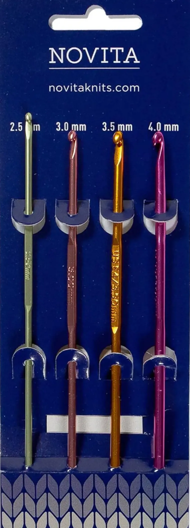 Novitan Värikkäässä Virkkuukoukkusetissä On Neljä Kaunista Metallihohtoisen Väristä Virkkuukoukkua: 2.5 Mm Vaaleanvihreä, 3.0 Mm Vaaleanpunainen, 3.5 Mm Kulta, 4.0 Mm Pinkki.
