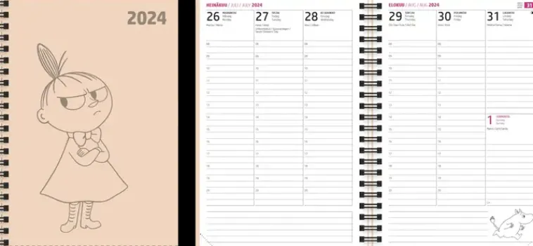 Ihastuttava Muumi Vuosikalenteri Vuodelle 2024. Vaalean Pinkin Sävyinen Ja Miellyttävän Tuntuinen Keinonahkakansi Pikku-Myy Painokuvalla. Kätevä Maxi-Koko 14 X 19,5 Cm, Jossa Kolmikielinen Viikkonäkymä 12 Kuukauden Sisällöllä, 47/2023-1/2025. Kielet Suomi, Ruotsi Ja Englanti. Suomalaiset Nimi- Ja Juhlapäivät. Löydät Aukeamilta Muumi-Hahmoja. Sisältää Vuosisuunnitelman, Liputuspäivät, Suomenkieliset Nimipäivät, Tehtävälistoja Ja Runsaasti Muistiinpanotilaa, Sekä Viivoilla Että Ruuduilla. Takakannessa Muovinen Tasku Lipuille Ja Kuiteille. Valmistettu Fsc-Sertifioidusta Paperista.