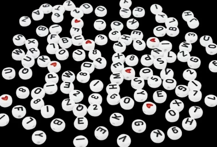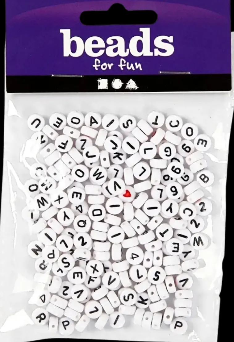 Pyöreät, Tasasivuiset Helmet Valkoista Muovia. Värillinen Kirjain- Tai Numeropainatus Helmen Molemmin Puolin, Joissain Helmissä Painatuksena Punainen Sydän