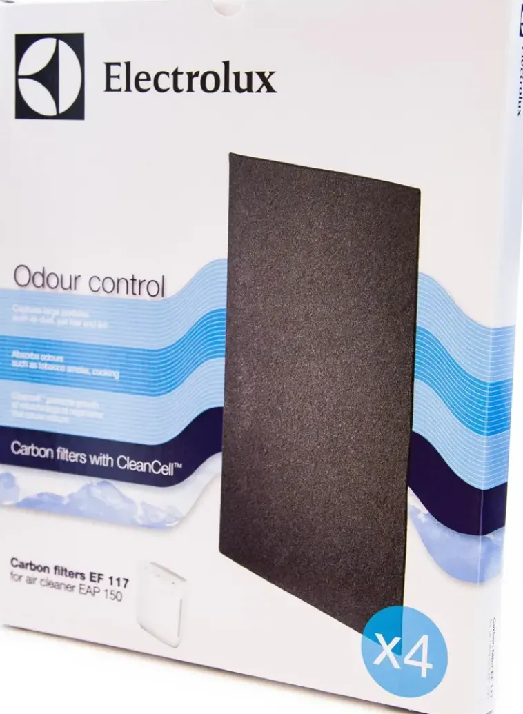 Electrolux Ef117 Aktiivihiilisuodatin. Suositellaan Vaihdettavaksi Uuteen 3 Kk:N Välein. Paketti Sisältää 4 Kpl Suodattimia. Riittävyys Noin Vuodeksi. Soveltuu Mallille Eap150.