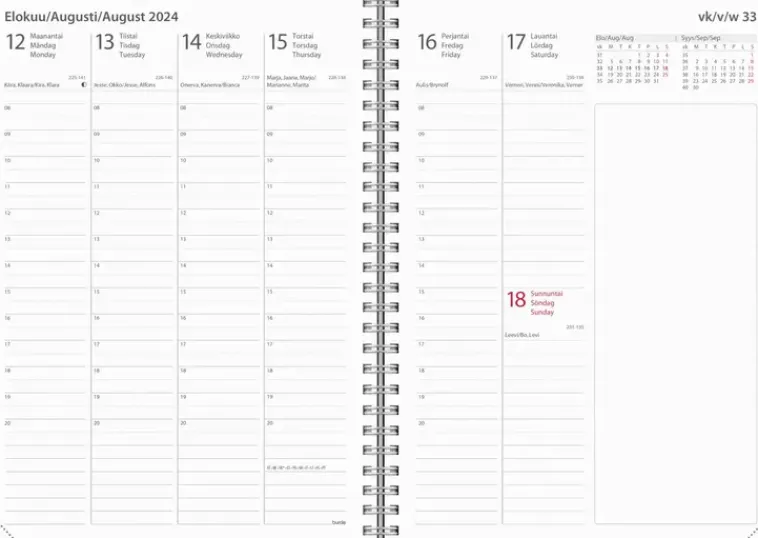 Pellavatekstiilikansi. Kalenterin Aukeamalla Yksi Viikko, Tuntijaotus 08-20, Palsta Muistiinpanoille, Kuluvan Ja Seuraavan Kuukauden Kalenteritaulukot. Kalenteri Sisältää Nimipäivät, Juhlapyhät, Liputuspäivät, Kuun Vaiheet, Vuosisuunnitelmat Kuluvalle Ja Seuraavalle Vuodelle, Vuosiruudukot Edelliselle, Kuluvalle Ja Kahdelle Seuraavalle Vuodelle, Kalendaariset Tiedot, Auringon Nousu- Ja Laskuajat, Yleiset Pyhäpäivät Maailmalla Ja Muistiinpanosivut. Kalenteriosa: Vk 48 2023-Vk 1 2025. Kolmikielinen: Suomi/Ruotsi/Englanti. Parikierresidottu. Koko: 148X210 Mm (A5).