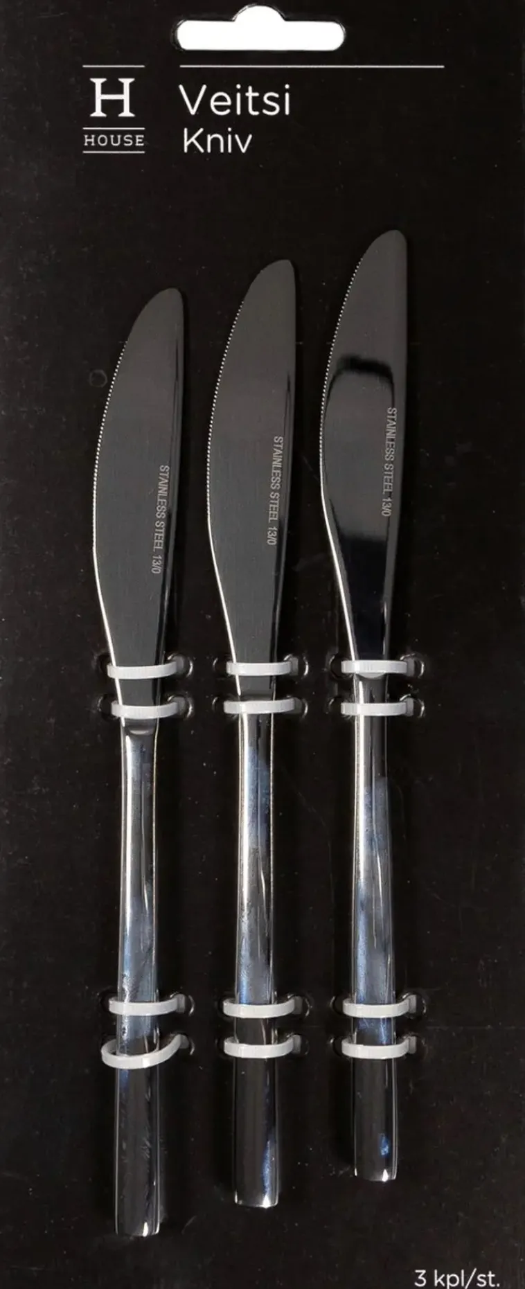 House Scandic -Ruokaveitsi, Kolmen Kappaleen Setti. Valmistettu Ruostumattomasta Teräksestä. Pituus 20,5 Cm. Aterimissa On Soikean Siro, Käteen Mukavasti Asettuva Varsi. House Scandic -Sarjaan Kuuluu Myös Ruokahaarukat Ja -Lusikat Sekä Kahvilusikat.