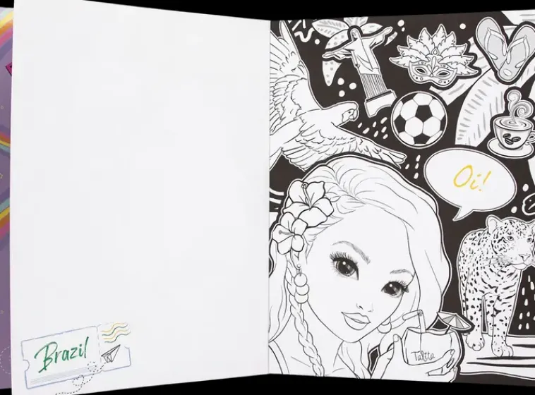 Kaunis Värityskirja, Jonka Värityskuvissa Musta Tausta. Kirjan Sivuilla Topmodel Tytöt Matkustavat Kiinnostaviin Kaupunkeihin Ympäri Maailmaa.