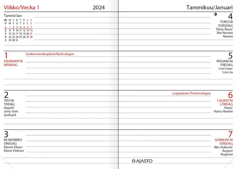 Kokonsa Ansiosta Mahtuu Taskuun Kuin Taskuun. Koko 72 X 102 Mm; Leatherette-Kannet; Sidottu; Kielisyys: Suomi, Ruotsi; Aukeamalla Viikkonäkymä; Päiväkirja 51/2023 – 1/2025; Vuosisuunnitelma 2025; Suomalaiset Ja Suomenruotsalaiset Nimipäivät; Kansalliset Vapaapäivät Luettelona; Liputuspäivät Suomessa; Vuosiruudukko; Muistiinpanotilaa.