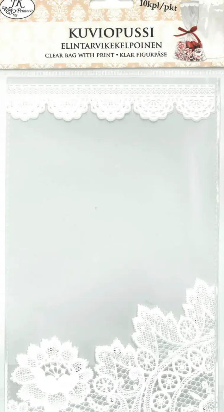 Pakkauksessa On 10 Kappaletta Kirkkaita Pusseja, Joissa Valkoinen Pitsipainatus. Tuote On Elintarvikekelpoinen. Yhden Pussin Koko On 23,5 X 14Cm.