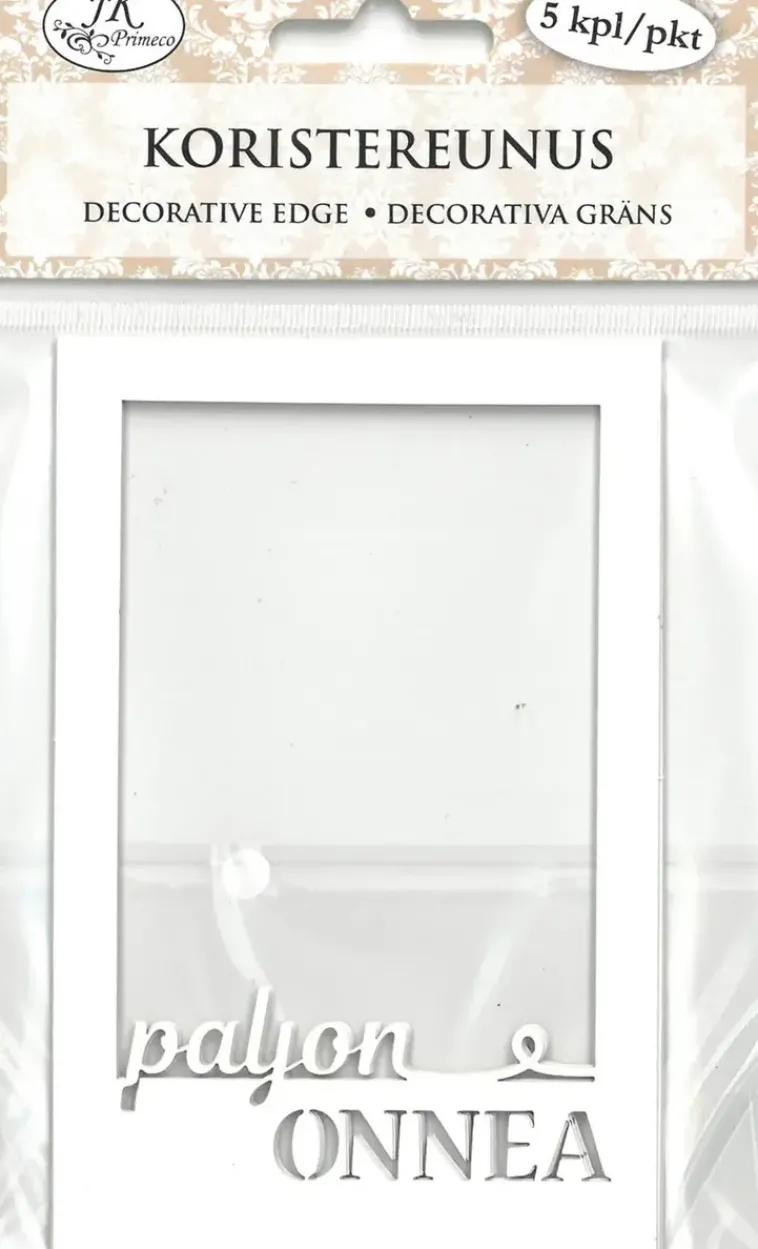 Koristereunus Askarteluun Ja Koristeluun. Pakkaus Sisältää Viisi Kappaletta Kartonkisia Koristereunuksia, Joissa On Laserleikattu Teksti. Yhden Reunuksen Koko On N. 11,5 X 7,6Cm. Koristereunuksen Vahvuus On 230G/M².