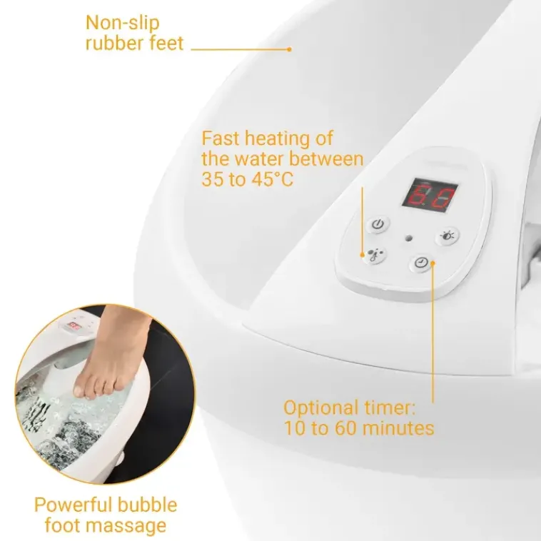 Erittäin Tehokas Premiun Jalkakylpy Medisana Fs888. Laite Lämmitää Veden Nopeasti 35 – 45 C Asteen Lämpöiseksi. Laitteen Pohjassa Olevat Hierontarullat Tarjoavat Nautinnollista Ja Rentouttavaa Hierontaa Väsyneille Jalkapohjille, Samalla Kun Voimakkaat Kuplat Hierovat Jalkateriä. Laitteen Voi Ajastaa Toimimaan 10 Minuutista 60 Minuttiin. Jalkakylpy Jäljittelee Todellista Spa-Nautintoa Ja Siinä On Integroitu Säiliö, Jonne Voi Laittaa Lempituoksu Sekä Laitteen Vaihtuvat Ambientte Valot Tuovat Ripauksen Luksusta. Jalkakylpy Sopii Jalan Kokoon 45 Asti.