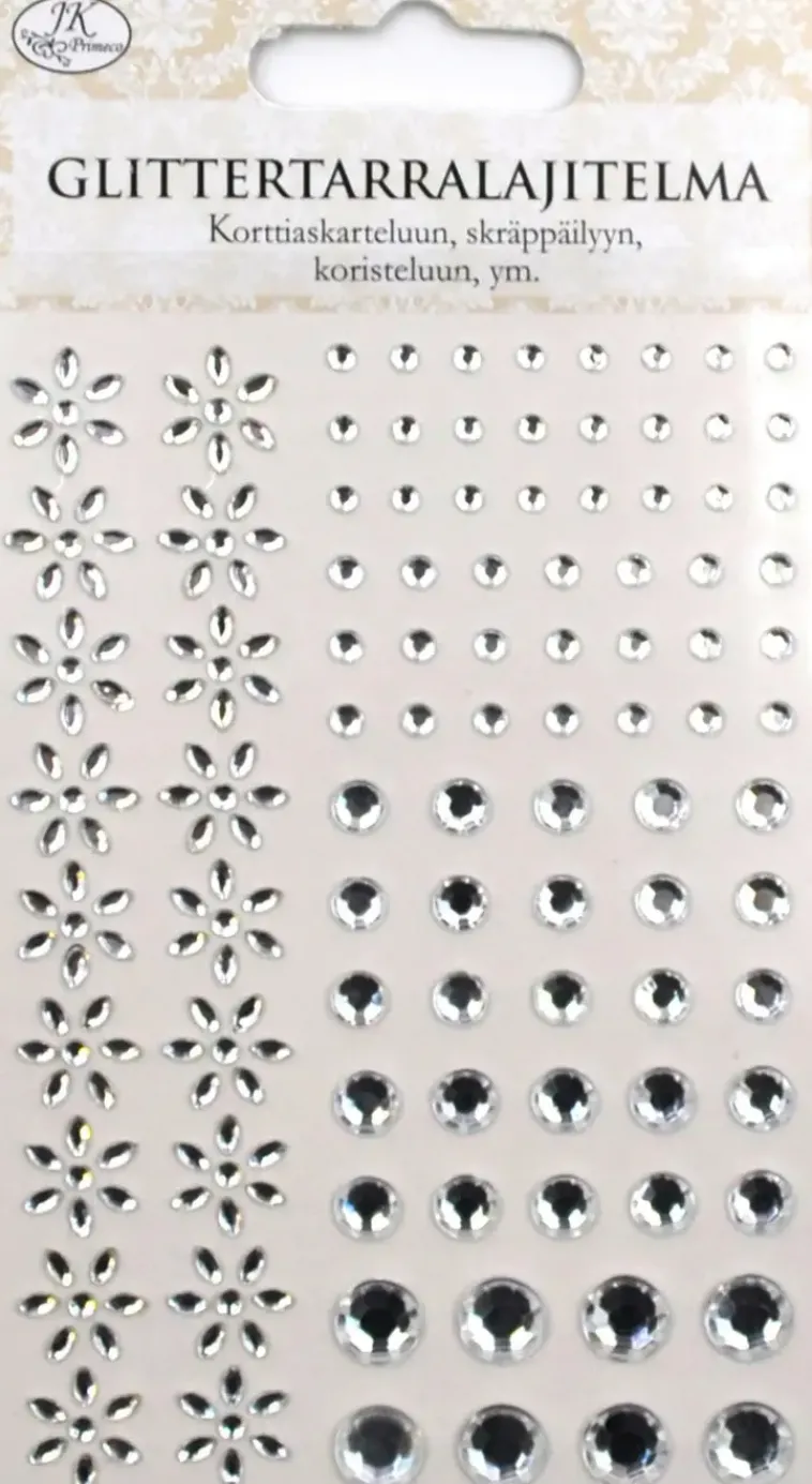 Pakkaus Sisältää Yhden Arkin Erikokoisia Glittertarroja Askarteluun Ja Koristeluun.