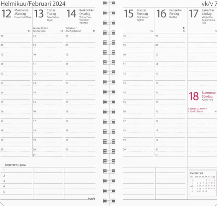 Kalenterin Aukeamalla Yksi Viikko Ja Kuluvan Kuukauden Kalenteritaulukko, Tuntijaotus 08-20. Kalenteri Sisältää Nimipäivät, Kansalliset Pyhäpäivät, Liputuspäivät, Kuun Vaiheet, Vuosisuunnitelmat Kuluvalle Ja Seuraavalle Vuodelle, Suomen Kartta, Välimatkataulukon, Kalendaariset Tiedot, Yleiset Pyhäpäivät Euroopassa. Erillinen Lyijytäytekynä Ja Puhelinmuistio. Kalenteriosa: Vk 44 2023-Vk 9 2025. Kaksikielinen: Suomi/Ruotsi. Parikierresidottu. Koko: 83X158 Mm.