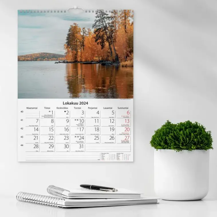 12 Kaunista Luontokuvaa. Aukeamalla Kahden Seuraavan Kuukauden Kalenteritaulukot. Kalenteri Sisältää Nimipäivät, Liputuspäivät, Kansalliset Pyhäpäivät Ja Kuun Vaiheet. Suomenkielinen. Parikierresidottu. Fsc®. Koko: 295X390 Mm.