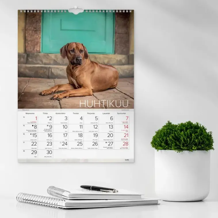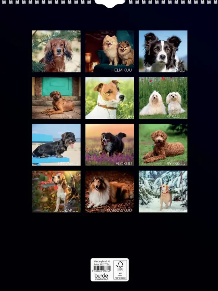 12 Kuvaa Eläinystävistämme. Kalenteri Sisältää Nimipäivät, Liputuspäivät, Kansalliset Pyhäpäivät Ja Kuun Vaiheet. Suomenkielinen. Parikierresidottu. Fsc®. Koko: 295X390 Mm.