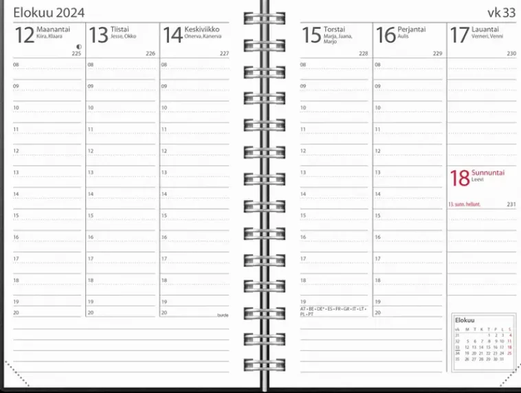 Musta Ympäristöystävällinen Uusiokartonkikansi. Kalenterin Aukeamalla Yksi Viikko, Tuntijaotus 08-20 Ja Kuluvan Kuukauden Kalenteritaulukko. Kalenteri Sisältää Nimipäivät, Kansalliset Pyhäpäivät, Liputuspäivät, Kuun Vaiheet, Kalendaariset Tiedot, Vuosisuunnitelmat Kuluvalle Ja Seuraavalle Vuodelle, Vuosiruudukot Kuluvalle Ja Seuraavalle Vuodelle. Kalenteriosa: Vk 50 2023-Vk 1 2025. Suomenkielinen. Parikierresidottu. Fsc®. Koko: 83X127 Mm.