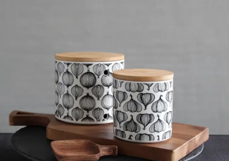 Valkosipulipurkki Puukannella Kätevään Säilytykseen Keittiössä. Purkissa On Sivuilla Reiät Ja Kansi Bambua. Tuote On Valmistettu Korkealaatuisesta Vitroposliinista.